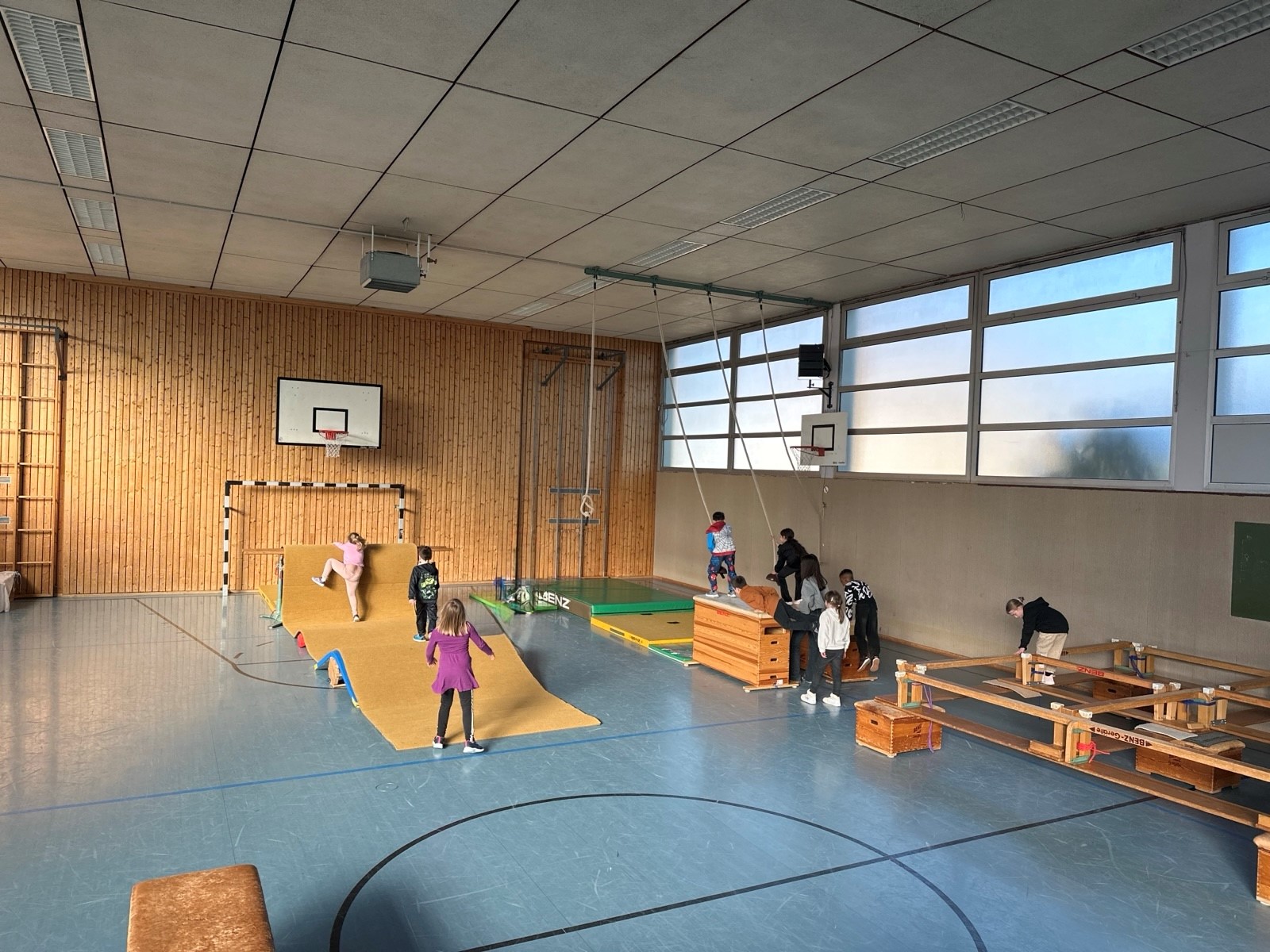 Auch dieses Jahr fanden vom 2.3. – 4.3.26 die „Psychomotorik-Tage“ statt. In der Sporthalle wurden mehrere Stationen aufgebaut, die Kraft, Ausdauer, Geschick und Mut abverlangten, aber auch mit viel Spaß verbunden waren. Mehrere Hindernisparcours aus Sitzbänken und Bodenturnmatten, eine „Gletscherspalte“ aus zwei Weichbodenmatten sowie Klettertaue zum Schwingen sorgten für viel Freude bei den Kindern und Jugendlichen. Die Psychomotorik zielt darauf ab, über Bewegung die Koordination, den Gleichgewichtssinn und die Wahrnehmung zu verbessern sowie das Selbstbewusstsein zu stärken. Im Erproben der eigenen Möglichkeiten gewinnen die Kinder und Jugendlichen an Selbstvertrauen und lernen auch Grenzen zu akzeptieren. Gemeinsam mit Grundschule Elsenz wie auch von den Kinderturngruppen des FVE wurde der “Indoor-Spielplatz” an drei Tagen genutzt.